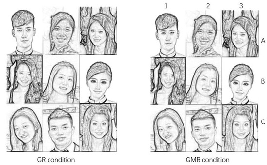 We combined each individual face and synthesized 9 of them together in a single group photo. In other words, photo stimuli were presented to the participants in groups of nine which were distributed as a 3 × 3 matrix by a combination of English letter (A–C) and Arabic number (1–3). The participants were asked to respond to questions which were then divided into two parts. Participants were first asked to rate the group’s overall facial attractiveness of the photo stimuli in GR condition (see Figure 2: GR condition), considering the following criteria or indicators such as: (1) physical attractiveness (how pretty the people in the photograph were), (2) friendliness (how kind the people in the photograph seemed), and (3) social attractiveness (to what extent would you want to belong with these people). Then, they were required to indicate the degrees of attractiveness of the group (1 = not at all attractive, 10 = very attractive): How attractive do you find this group (1 = not at all attractive, 10 = very attractive)? After this, they were asked to rate the attractiveness of each individual face in GMR condition (see Figure 2: GMR condition): How attractive do you find group member A1 (1 = not at all attractive, 7 = very attractive)? Thus, Study II was a within-subject design with rating conditions as a factor (two levels with respect to two conditions), where rating scores were the dependent variables.