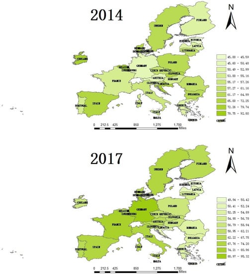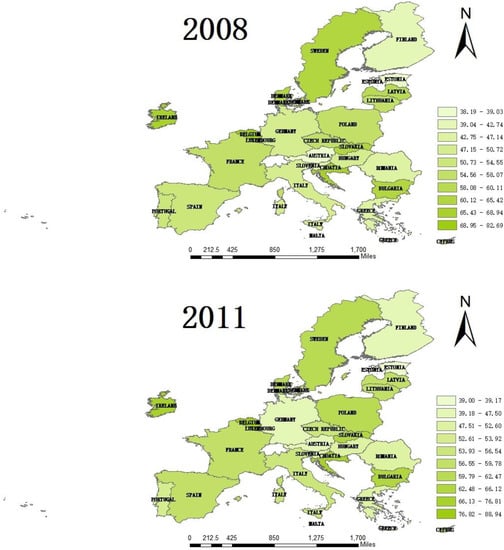 From the perspective of the dynamic evolution of the public health service capacity of the 27 countries of the EU, there has been a gradual increase trend. This is closely related to the development of science and technology, people’s growing medical and health needs. The scores of some countries greatly improved between 2008 and 2017, especially Latvia, which is basically ranked in the bottom three, but its score increased by 36.79% from 38.19 in 2008 to 52.24 in 2017. This is because the total land area of Latvia is 62,046 square kilometers and the total population remains at about 2 million. The demand for public health service capacity is small, so it has a low base starting point and large room for improvement. However, there are significant differences in the capacity of public health services among different countries of the EU. As a country with a relatively high level of medical and health care, Germany’s public health service capacity score increased by 15.27% from 2008 to 2017 [30]. In particular, the score in 2008 was 82.69, which is about 1.5 times that of other countries. In terms of phases, the growth rate of countries from 2008 to 2010 was slower. The growth rate was relatively fast from 2011 to 2013, and it remained basically stable afterwards. It can be seen that countries in the EU have paid more and more attention to public health services.