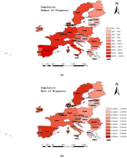 Europe is one of the hardest hit areas of the COVID-19 epidemic that has swept the world. Countries in the EU account for the majority of the countries with the most confirmed cases. None of the 27 member states have been spared. According to the data from official announcements of the World Health Organization and governments, the epidemics in Italy, Spain, Germany and France are very serious. As can be seen from Figure 2 below, among the EU, countries in Western European with more developed economies and strong public health service capabilities are the hardest hit areas, such as Italy, Spain, Germany and France. The cumulative number of confirmed cases has reached more than 200,000. Spain is the most serious, with a cumulative number of diagnoses of 354,530. Countries in Eastern European with weaker public health service capabilities are generally lighter, such as Cyprus and Latvia, where the cumulative number of confirmed cases is less than 1300. The epidemic reflects the public health service capacity indirectly. However, this is also closely connected to the emergency response mechanism and the government’s ability to judge, make decisions and implement public policies [43].