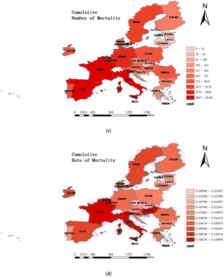 The graduated color figures of the EU about cumulative number of diagnoses (a), cumulative rate of diagnoses (b), cumulative number of mortality (c) and cumulative rate of mortality (d) (by 8 August 2020).