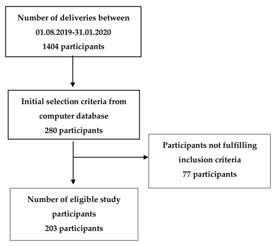 The prospective study included 203 eligible female participants that were admitted to the Obstetrics ward for delivery between 1 August 2019 and 31 January 2020. Eligible female participants were defined as singleton pregnancies that were not conceived using assisted reproductive techniques (ART). All pregnant women in this study had low risk of chromosomal disorders based on noninvasive prenatal testing. The selection of study participants was described in a flow chart (Figure 1). To minimize the possibility of bias in the study, we established inclusion and exclusion criteria, since for pregnant women who underwent ART, several parameters might influence the possibility of the bias. According to Serbian National Regulation defining artificial reproductive technique (ART) procedures, increased BMI is considered as an exclusion criteria for ART procedures [17]. More frequent pregnancy related complications associated with frequency of advanced maternal age, multifetal pregnancies, Cesarean delivery as a more frequent delivery mode are well known complications associated with ART procedures. Due to increased adverse pregnancy and perinatal outcomes associated with ART procedures in comparison with naturally conceived pregnancies, those women were excluded from the study [18,19,20,21,22,23].