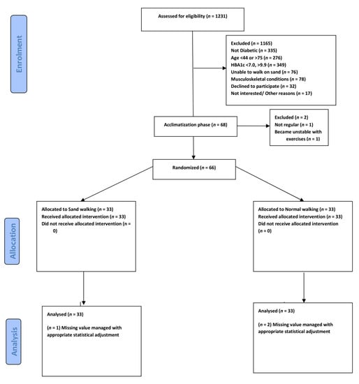 We randomly selected 66 participants suffering from chronic T2DM, sedentary, and overweight. The participants were allocated randomly into two groups, Firm-surface walking (n = 33), Sand Walking (n = 33).