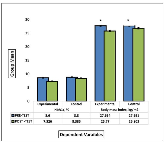 Comparison between the group means of HbA1c and BMI before and after the intervention. * signify statistical significant different between pre-test and post test mean scores of experimental and control groups.
