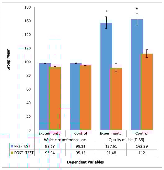 Comparison between the group mean of Waist circumference and Quality of life before andafter intervention. * signify statistical significant different between pre-test and post test mean scores of experimental and control groups.