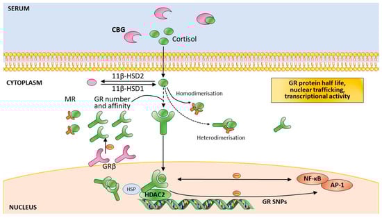 Chaperones and co-chaperones influence GR affinity for GCs. In particular, the co-chaperone of the heat shock protein (hsp)-90 FKBP5 gene is subject to the transcriptional influence of the GR upon cortisol binding, leading to an increase in its expression, which is associated with GC resistance, serving as an intracellular feedback control of GC actions [68,69].