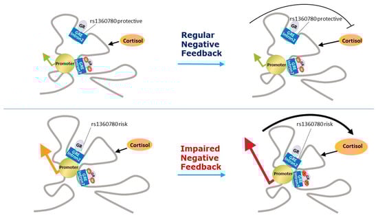 Klengel et al. [14] found that this diversity is determined by developmental impacts, such as early childhood adversities, which occurred by way of epigenetic mechanisms in the FKBP5 SNP rs1360780 (Figure 2). This study showed that being a carrier of this FKBP5 SNP risk allele, together with being exposed to early childhood adversities, both lead to FKBP5 intron 7 demethylation. Furthermore, a recent meta-analysis found strong evidence of interactions between FKBP5 genotypes in three SNPs (namely risk allele carriers of the rs1360780, rs3800373, or rs9470080) and early-life stress, which the authors considered could constitute significant risk factors for stress-related disorders such as PTSD [152]. Unfortunately, rs9296158 FKBP5 SNP, which has been found to be associated with PTSD in a recent metanalysis [18], was not included.