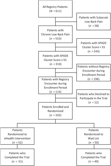 A total of 100 (98%) of the 102 randomized patients completed the trial (Figure 1). There were two (4%) patients who were unable to receive the eHealth intervention via online delivery and received it in person. The mean age of patients at baseline was 51.0 years (SD = 13.3 years), and 86 (84%) were women. The mean baseline SPADE cluster score was 61.6 (SD = 4.2). The mean scores for the NRS for low back pain intensity and RMDQ for back-related disability were 6.1 (SD = 1.8) and 16.8 (SD = 4.8), respectively. Randomization was successful in achieving balanced treatment groups, as there were no significant differences between patients in the experimental and control treatment groups in any of the 30 baseline characteristics except the SPADE depression scale score (Table 1).