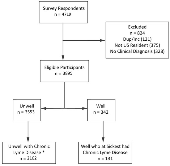 To promote participation in the survey, various recruitment strategies were utilized including blogs and social media as well as professional conference presentations about the registry. Participation in the registry is voluntary, and all respondent identities remain strictly confidential. When launched, the MyLymeData patient registry research study was approved by the Advarra Institutional Review Board and subsequently approval has been renewed annually. In addition, the analysis of the survey data for this study was exempted from review by the University of California Los Angeles Institutional Review Board because it did not meet the definition of direct human subject research.
