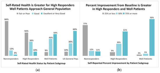 (a) Self-rated health is greater in high responders and well patients, with well patients approaching the general population. (b) Percentage of improvement from baseline is also greater in high responders and well patients.