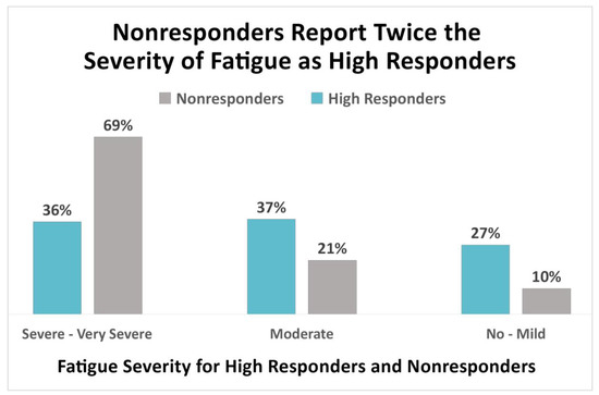Severe and very severe fatigue is reported by nearly twice as many nonresponders (69%) compared to high responders (36%).