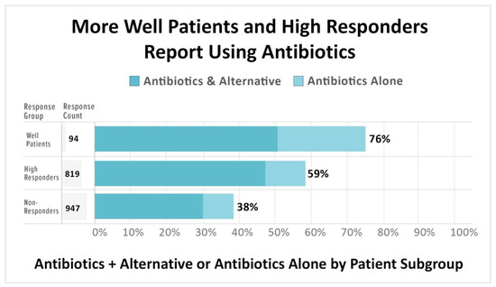 A greater percentage of well patients (76%) and high responders (59%) report using antibiotics or a combination of antibiotics and alternative treatments compared to nonresponders (38%).