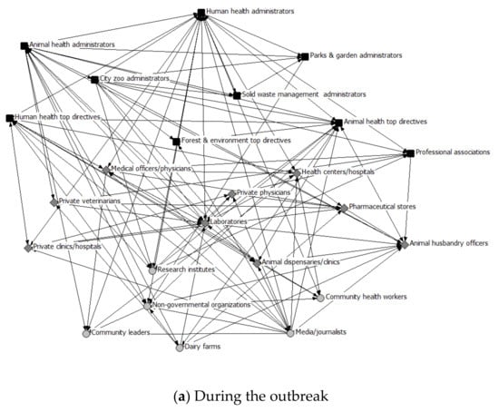 The health system network analysis provided quantitative support to the qualitative findings and compared the interaction among the actors during the last outbreak (H5N1 in 2017) with those of non-outbreak situations. The analysis of different network parameters for both outbreak and the non-outbreak situation are shown in Table 1. A density value of ‘1’ is expected in a fully collaborated network. The overall network density signified higher interaction among the actors (0.328) during the outbreak as compared to the non-outbreak situation (0.163). This pattern was also observed upon disaggregating the data by the health system level (see Table 2). The other two network parameters—i.e., average degree and degree of centralization—have also exhibited higher values during outbreak compared to non-outbreak situations. The degree of centralization signified that few nodes have higher ties, especially among the administrative actors. Although the degree of centralization among the administrative actors (0.564, 0.473) and provider actors (0.625, 0.607) remained the same in the outbreak and non-outbreak situation respectively, the degree reduced (from 0.556 to 0.205) among the interaction between administrative and provider actors. This highlights that cross-level interaction varies greatly between outbreak and non-outbreak situations. At the same time the higher degree of centralization, which remained the same across outbreak and non-outbreak situations, indicated that few actors govern the collaboration pattern and information flow and are; therefore, the key actors to establish sustainable collaboration patterns. Figure 1 presents the nodes and their ties in the two discussed situations. For visualization purposes, different shapes and colors were used: dark-colored squares for administrative actors, medium grey diamond shapes for provider actors, and light grey circles for community actors. One important finding was that the prime administrative actors, who were well-positioned and highly interconnected during outbreaks, significantly reduced the number of ties during non-outbreak situations. The IIM matrix also reflected that the district level administrative actors have a high influence on most city-level actors, which resulted in coordinated activities during the outbreak. These density values could not be attributed directly to the stage in the continuum of ISC, nonetheless, a qualitative attribution indicates a range from the communication (during non-outbreak) to the coordination (during an outbreak) as per the need in the local context. In summary, there was significantly lower interactions during non-outbreak situations across all the network measures, very low ISC both during the outbreak and non-outbreak situations; however, a high centrality remained at the administrative level both in the outbreak and non-outbreak situation.