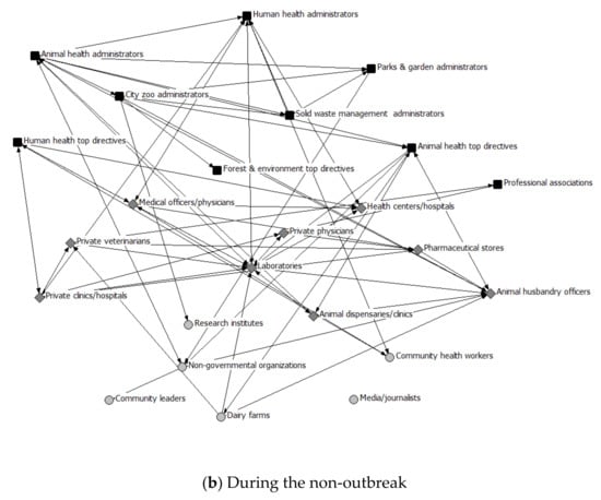 The collaboration at the provider level, especially between physicians and veterinarians, were found to be very poor. However, there is some supportive global evidence that OH collaboration at the provider level is possible through case referral systems or combined OH clinics [71,72]. A study by Speare et al., explored the possibilities for physicians and veterinarians to formally collaborate in managing zoonoses in clinical situations and documented that 90% of actors agreed to collaborate if the appropriate insurance covers the cost [73]. As this is not the case in this study, some sensitization through OH training would be recommended. Another review also discusses the role of veterinarians and physicians in confronting zoonoses and discusses the importance of multi-sector partnerships in controlling zoonoses [74]. Furthermore, this type of ISC has also been envisaged in developed nations, where physicians and veterinarians are involved in joint patient counseling or joint clinical services for minimizing the risk of zoonoses [75,76,77]. In the local context, the actors from the provider level indicated that ISC should be at the community level rather than at the provider level. This might be due to the high caseload in their daily routine, absence of clinical knowledge on zoonoses, or lack of awareness. In the local context, the horizontal collaboration between the human and animal health system at the community level is not possible, as there are no active actors from the animal health system; however, the existing network of community health workers of the human health system could be utilized for raising the community awareness and risk mitigation. Similar community-based risk mitigation through an OH approach has been documented in other parts of the globe [78]. The network cohesion among the provider level actors did not differ much between the outbreak situation and the non-outbreak situation. One of the potential reasons could be the presence of private veterinarians in the network, and the other reason could be few of the provider actors were only engaged in collaborative activities during the outbreak resulted in the minimal difference in the network cohesion at the provider level.