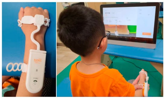 RAPAEL Smart Kids is a sensor-based rehabilitation training tool for children with neurological disorders. This wearable SG can sense wrist movement, which includes forearm supination/pronation, wrist flexion/extension, and wrist radial/ulnar deviation. Moreover, RAPAEL Smart Kids can be accompanied by 35 video games (e.g., fishing, sorting, driving, cooking, cutting, cleaning, painting, playing instruments, puzzle matching, etc.) designed to induce the targeted movement of the paretic wrist and forearm. Each game is categorized by cognition, active ROM, coordination, and timing, depending on the area of treatment. The game provided feedback in real-time and that induces high scores. Based on the judgment of the occupational therapist, the difficulty level and the treatment time of each game were adjusted to patients.