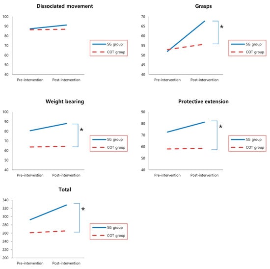 Mean of QUEST scores at pre- and post-intervention in the SG and COT groups. * Significant differences between groups (ANCOVA, p < 0.05). SG, Smart Glove. COT, conventional occupational therapy.
