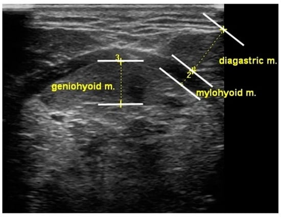 In this study, tongue and suprahyoid muscle thickness was measured using a portable ultrasonography device (SONON300L, Healcerion, Seoul, Korea) with a 10 MHz and linear- and convex-array transducer. Change in tongue thickness was determined by measuring the distance between the upper and lower surfaces of the tongue muscles in the center of the plane perpendicular to the Frankfort horizontal plane of the frontal session. The vertical distance was measured from the surface of the mylohyoid muscle to the dorsum of the tongue. The digastric muscle measurements were obtained from the upper to the lower boundary of the fascia covering the muscle at the broadest point perpendicular to the mylohyoid muscle. The mylohyoid muscle measurements were recorded below the measurement point of the digastric muscle, from the upper to the lower boundary of the fascia covering the muscle (Figure 2). A blinded investigator (rehabilitation physician) measured and analyzed the muscle thickness using ultrasound.