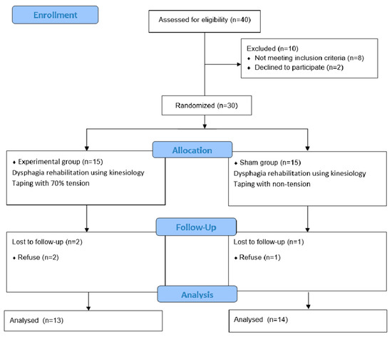 This was a prospective, randomized, double-blind sham-controlled study. Thirty patients with dysphagia after stroke were enrolled in this study. Inclusion criteria: Dysphagia within 6 months of stroke onset, oropharyngeal dysphagia confirmed via a videofluoroscopic swallowing study, ability to swallow voluntarily, ability to swallow against resistance of tape, a cognitive disability score of >22 points in the Mini-Mental Status Examination (MMSE), adequate communication abilities, and tongue pressure >20 (kPa). Exclusion criteria: Secondary stroke, presence of other neurological diseases, underwent tracheostomy, unstable medical condition, skin problems associated with taping attachment, pain in the cervical spine, and main problems with the esophageal phase such as achalasia or UES opening. Ethical approval was obtained from the Dongseo University Institutional Review Board prior to the experiment (1041493-A-2020-001). The data collected during 1 April–20 July 2020 and this study was not registered in a public trials registry.