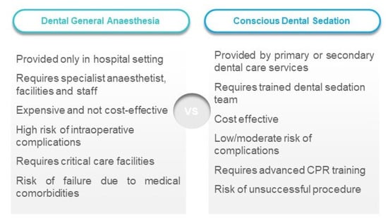 In the United Kingdom, the Department of Health (England) report published in 2000 ordered the confinement of GA to a hospital setting that has critical care facilities, with the immediate effect that GA cannot be provided within the primary care setting and must only be applied by a registered specialist anaesthetist, a trainee working under supervision as part of the Royal College of Anaesthetists, or a non-consultant career-grade anaesthetist under the supervision of a named consultant anaesthetist [17,18]. Inevitably, there is the significant issue of cost, where DCS provision is much more cost-effective compared to GA service provision restricted to hospital-based services (Figure 2). DCS can be provided independently by local sedation teams in the primary/secondary care setting and this would support people who require anxiolytic measures, those who might benefit from sedation for medical reasons, or for vulnerable people with learning difficulties and disabilities. Furthermore, it is important that a wide margin of safety in terms of side effects is maintained during DCS, compared to that needed in the unconscious state in case of deep or general anaesthesia. Adequate and appropriate conscious sedation techniques should prevent the necessity of rescheduling procedures when sedation is unsuccessful. What is more, taking into consideration the valid, informed consent aspect required by law, an anxious child who might benefit from dental care under sedation under the age of 16, and who is deemed to be “Gillick competent”, i.e., is considered mature enough to be able to satisfy the requirements of informed consent, can provide an individual consent for treatment under sedation without the requirement for parental consent. Although it is always recommended to involve the parents/legal guardian in the consent process for a Gillick competent child under the age of 16 [17].