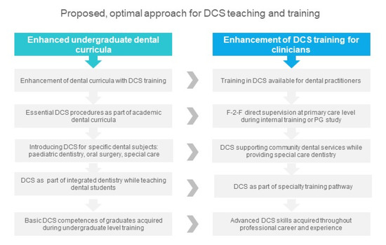 Dental professionals are always eager to master new skills and gain knowledge relevant for their workplace; unfortunately, the options for further training at university level can be quite limited. We would welcome and encourage dental departments, as well as national societies and organizations all over the world to support continuous professional development in lifelong learning mode, with structured DCS training for dental practitioners, in the form of postgraduate studies in DCS (certificate/diploma). In the U.K., professional bodies such as SAAD, the British Society of Disability and Oral Health (BSDH), and the Royal Colleges have a well-established history of continuous support for dental practitioners. Moreover, specialty-orientated postgraduate curricula in dental subjects might be extended and enhanced with the expertise in practical application of DCS for diverse groups of patients. The changes we have seen in society enforced upon populations by the COVID-19 pandemic have shown the innovations that can happen through adversity. The rise in online communication during this time demonstrated that the theoretical aspects of many training programs may be delivered through distance learning and hybrid/blended learning formats. What is more, implementation of novel, combined, and/or advanced DCS techniques [23,24] by primary/secondary dental care providers is likely to diminish the impact of limited GA sessions and the overall burden of restricted access to the hospital setting as a result of any epidemic scenario in future, if it occurs. The new DCS postgraduate training curriculum model ought to comprise specific and unique elements managed by interdisciplinary consultants and faculty experts. The process of DCS training reform aims to move from a traditional isolated curriculum to one that uses integrated multidisciplinary courses to improve teaching outcome and practical skill acquisition, being beneficial for community and special dental care teams (Figure 3). This reformed curriculum should incorporate inter- and multidisciplinary courses, case-based active learning strategies, and concepts from continuous professional development theory [25]. Perhaps, a disruptive innovation in education might be required to alter the well-established model to improve the existing standards in DCS training. In fact, the provision of DCS skill sets is best achieved by on-site training, delivered locally, arranged by local dental teams, groups of enthusiastic professionals, and senior colleagues who can share their experience and knowledge. These practical skill sets can often only be taught with face-to-face (F-2-F) methodology, but the use of blended learning may reduce the difficulties of attending courses by limiting the amount of F-2-F teaching required. By raising the importance profile of DCS, organizations may be urged to support and train staff members in order to enhance their clinical skills and provision of DCS to the targeted groups of vulnerable patients. This is especially important and applicable in community dental service, where sedative techniques can be extremely useful, it may also encourage senior staff to become mentors to staff new to DCS techniques.