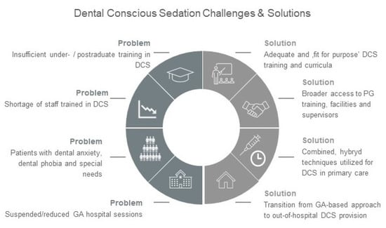 The COVID-19 pandemic has resulted in the biggest challenge that community and special care dental services have ever faced, and it has brought to light the shortfalls of DCS. This major disruption of healthcare should serve as a red flag that signals the need to enhance the way we manage patients with special needs. Challenges in the development and implementation of the reformed DCS provision, along with practical solutions, can be efficiently managed with the support of educators and healthcare commissioners supported with agenda for constructive changes (Figure 4). The more prepared dental sedation services are now, the more likely it is that any new crisis could have less impact on workflow and patient care; so, re-evaluation and re-adjustment is a key element of long-term success. Providing anxiety management during dental treatment is important for psychological and medical reasons, considerably reducing the risk of medical emergencies and supporting medically compromised patients [29]. Removing the possibility to provide DCS during the pandemic can adversely affect both. More importantly, as DCS is cost effective, easily learned, and well accepted by patients, it might be applicable across a wide variety of clinical situations and patient groups, regardless of their age and medical status.