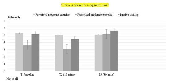Mean values for item “I have a desire for a cigarette now” in all conditions. T1: Time 1—Baseline pre-intervention. T2: Time 2–10 min of exercise. T3: Time 3–30 min post-intervention.