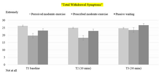 Mean values for Total Withdrawal Symptoms in all conditions. T1: Time 1—Baseline pre-intervention. T2: Time 2–10 min of exercise. T3: Time 3–30 min post-intervention.