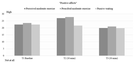 Mean values for Positive effects (PANAS) in all conditions. T1: Time 1—Baseline pre-intervention. T2: Time 2–10 min of exercise. T3: Time 3–30 min post-intervention.