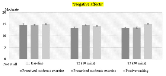Mean values for Negative affect (PANAS) in all conditions. T1: Time 1—Baseline pre-intervention. T2: Time 2–10 min of exercise. T3: Time 3–30 min post-intervention.