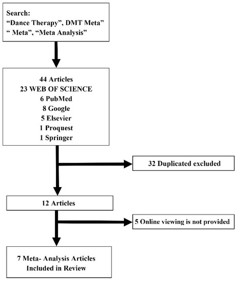 Moreover, a list was prepared comprising studies that included the following words in their titles and keywords (main themes): [Dance Therapy, DMT, Meta, Meta-Analysis], and [Dance Therapy Meta, Dance Therapy Meta-Analysis, DMT Meta]. Precaution was taken to ensure that there were no missing research materials when selecting the studies. In addition to the search of research materials, a secondary search was performed, following the citations of the selected research materials. The final subjects of the studies were selected after consensus had been reached based on discussion of the selection criteria and the list of research materials prepared by the three researchers. A total of 44 individual studies on meta-analysis related to dance therapy were collected, and seven (from academic journals) were selected as the final individual studies, excluding 32 overlapping studies and five that were not available online or that did not provide original texts. The specific details are shown in Figure 1 below.