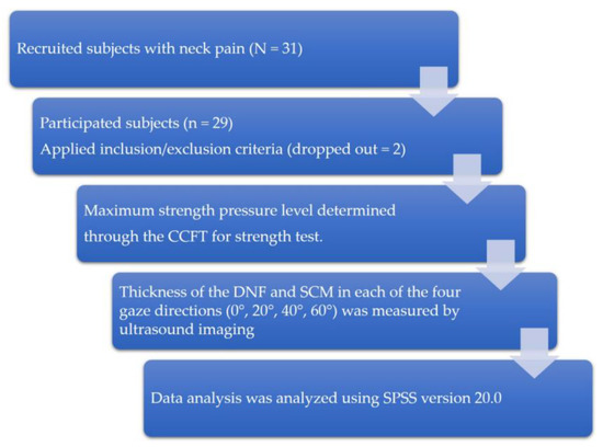 This study was conducted between September and December 2019 in Daejeon City, South Korea. The type of study is cross-sectional design (Figure 1). Twenty-nine CNP patients were enrolled. Assuming an effect size of 0.25, a power level of 0.80, and a significance level (α) of 0.05, we used the general power program to calculate that a minimum number of 24 subjects were required. The inclusion criterion was to have experienced idiopathic pain between the suboccipital region and the T1 level, with a duration of at least 6 months and a frequency of no less than once a week [32]. The criteria for exclusion of subjects achieving less than 26 mmHg in the CCFT test [19] were: radicular (dermatomal pattern) pain with symptoms suggesting nerve root involvement when screened by the Spurling test [33,34], and clinical cervical instability (level 6) as assessed by a joint mobility test [35]. This study was conducted in accordance with the Declaration of Helsinki and received approval from the institutional review board of Konyang University (KYU-2019–331–01) and the Clinical Research Information Service (Clinical IRB KCT0005261). Written consent was obtained from all participants. This study recruited 31 subjects with neck pain through the recruitment announcement in the hospital lobby, outpatient department, and ward. Two subjects with clinical cervical instability (level 6) were excluded, and finally 29 subjects participated in the study. All subjects first had their maximum strength pressure level determined through the CCFT for strength test. At each measured pressure, the thickness of the DNF and SCM in each of the four gaze directions (0°, 20°, 40°, and 60°) was measured by ultrasound imaging, and the results were analyzed.