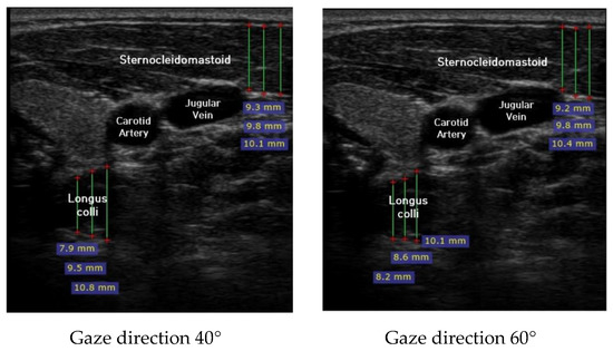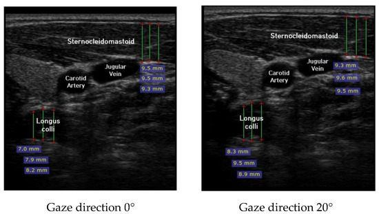 Ultrasound imaging of neck flexor muscles (longus colli and the SCM) was conducted using a real-time ultrasound device (Sonoview, SAMSUNG, Korea, 2018) with an 8-MHz, 38.7-mm linear array transducer [29]. With the subject in the CCFT position, the air-filled pressure sensor unit was set to the pressure of measured maximum strength, and ultrasound imaging of the longus colli was performed in each of the four steps (0°, 20°, 40°, and 60°) of the pre-installed guideline of gaze direction. The SCM was measured [30]. At that time, the movement of the neck joint was limited to allow only a change in gaze direction. In each step, a 1-min rest period was provided to prevent the subject from experiencing muscle fatigue during the muscle contraction process. The transducer was positioned at the C5–C6 level, 1.5 cm below the occipital process [45]. To calculate the thickness of the longus colli and SCM, three lines were drawn on the muscle at the farthest distance from the inside of the fascia boundary, and the average value was taken (Figure 2). The measured thickness was normalized as follows, according to a previous research method [46,47,48]: DNF contracted ratio 20° = DNF20°-DNF0°; DNF contracted ratio 40° = DNF40°-DNF0°; DNF contracted ratio 60° = DNF60°-DNF0°; SCM contracted ratio 20° = SCM 20°-SCM 0°; SCM contracted ratio 40° = SCM 40°-SCM 0°; SCM contracted ratio 60° = SCM 60°-SCM 0°; and DNF to SCM ratio = DNF-SCM.