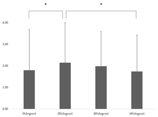Participant characteristics are presented in Table 1. The DNF-SCM varied significantly according to gaze direction (p = 0.04), and post-hoc analysis revealed that the DNF-SCM for gaze directions of 20° was significantly different from that for a gaze direction of 0° (p = 0.009) and 40° (p = 0.041) (Table 2) (Figure 3). There was no significant difference in DNF activation according to gaze direction, and there was a significant difference in SCM activation according to gaze direction (p = 0.001). Post-hoc analysis revealed that SCM 60° was significantly different from SCM 20° (p = 0.001) and SCM 40° (p = 0.001) (p < 0.05) (Table 2).