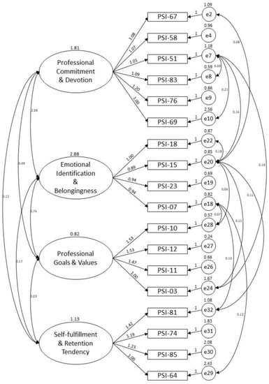 Discriminant validity was evaluated by comparing the square root values of the average variance extracted (√AVE) with the values of the correlation coefficients (r) between factors. Discriminant validity is proven if the √AVE is higher than the r between factors [38]. Table 6 presents the results of the average variance extracted (AVE), square root of AVE (√AVE), and matrix of correlations between factors. Table 6 also shows that the criterion is met with respect to the discrimination between “professional commitment and devotion” and “professional goals and values” (√AVE = 0.806 and 0.824, respectively; r = 0.398), between “professional commitment and devotion” and “self-fulfillment and retention tendency” (√AVE = 0.806 and 0.690, respectively; r = −0.089), between “emotional identification and belongingness” and “professional goals and values” (√AVE = 0.871 and 0.824, respectively; r = −0.477), between “emotional identification and belongingness” and “self-fulfillment and retention tendency” (√AVE = 0.871 and 0.690, respectively; r = −0.092), and between “professional goals and values” and “self-fulfillment and retention tendency” (√AVE = 0.824 and 0.690, respectively; r = 0.019). There is a marginal discriminant validity between “professional commitment and devotion” and “emotional identification and belongingness” (√AVE = 0.806 and 0.871, respectively; r = 0.832).