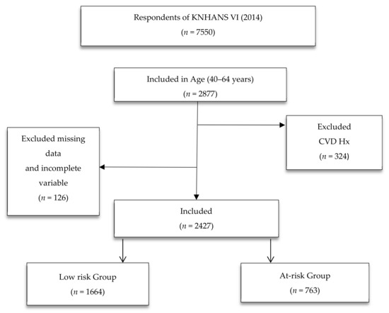 The current study received approval for data use by accessing the KDCA website [24]. We downloaded the Sixth KNHANES questionnaires and results in SPSS format. We excluded participants aged between 40 and 64 years with a history of CVD (n = 324), and those with insufficient information (n = 126). As a result, 2427 of the total 7550 participants were included in this study (Figure 1).