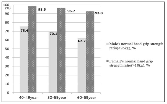 Handgrip strength (HGS) not only indicates the muscle strength of upper extremities but can also indicate that of the central core and lower extremities if measured in a standing position. It is also used to diagnose sarcopenia [3], and a better handgrip strength may be associated with cardiac functions and structures that help reduce the risk of cardiovascular incidents [4]. Other previous studies have also shown the association of HGS with frailty [5], falls [6], functional limitation [7], nutritional status [8], diabetes [9], osteoporosis [10], metabolic syndrome [11], and mortality rate [12,13]. HGS varies by country; HGS among Koreans is strongest among those in their late 30s and begins to decrease after they enter their 40s [14].
