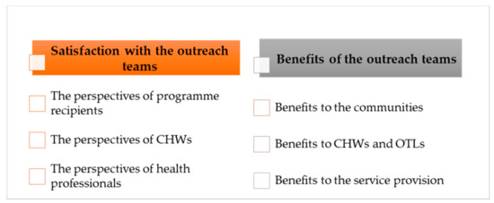 A semi-structured interview guide was developed to address three components of a process evaluation to assess how the ward-based outreach team programme was being implemented by managers, team leaders, and community health workers. To that effect, the perceptions of HCWs and CHWs were sought to assess the acceptability of the WBOT programme in the Nkangala district as well as how the programme benefitted the programme staff and recipients. Acceptability refers to determining how well an intervention will be received by the target population and the extent to which the intervention meet the needs of the target population and the organisational setting. The data sources were asked, among other questions, (1) how satisfied they were with the way the outreach team activities were carried out, (2) how acceptable the outreach program was, and (3) the benefits of the outreach programme to the community, the program staff, and the health system. They were also asked to make recommendations to improve the implementation of the outreach programme.