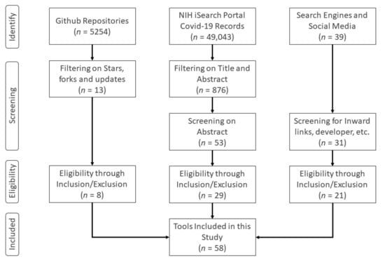 In parallel to the NIH search portal, we searched through Github, the well-known and established code-hosting portal, for COVID-19 topic. Of the 5254 repositories containing the topic, we selected 20 based on the number of stars (more than 1000) and forks (more than 100). Using the inclusion/exclusion criteria (see Section 3), 13 repositories were evaluated and only eight were retained. Finally, we monitored Twitter, Facebook, Research Gate (http://www.researchgate.net), Research Stash (http://www.researchstash.com), and scientific magazines for appearance of any hashtags and titles related to COVID-19 in the month of July 2020. These resulted in 39 distinct web-applications, which were screened for the reputation of developer and inward links pointing to the websites, resulting in 31 candidates. After applying the inclusion/exclusion criteria, we found 21 such applications eligible for our study. Combining the final candidates from these sources, we were left with 58 applications in our final analysis.