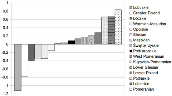 Comparison of Polish voivodeships with respect to the increasing value of the WB indicator. Source: Authors’ calculations.