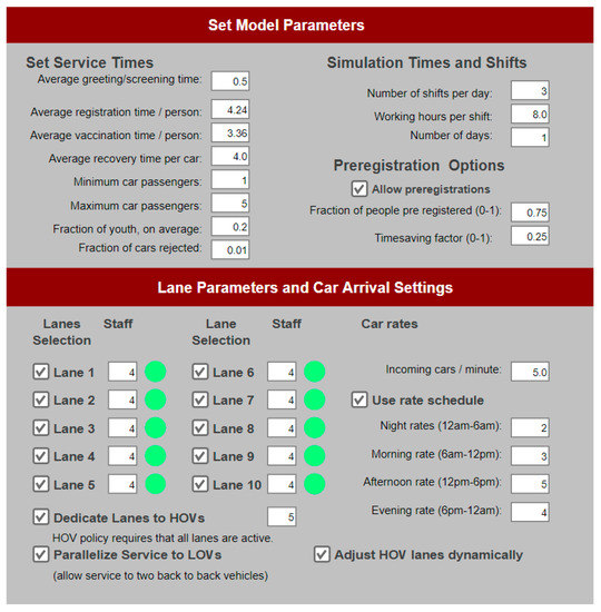 - Asgary, A.; Najafabadi, M.M. Drive Through Mass Vaccination Sim for COVID-19. Available online: https://cloud.anylogic.com/model/583c2075-6a8b-41be-8a03-d692eba71683?mode=SETTINGS (accessed on 10 August 2020).
