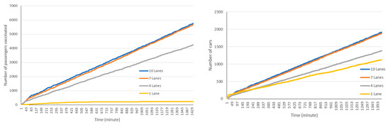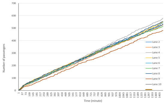 Figure 6 shows the total number of passengers served in each lane. Some differences are observed among the total number of cars and passengers for each lane.