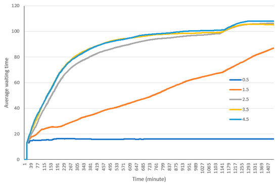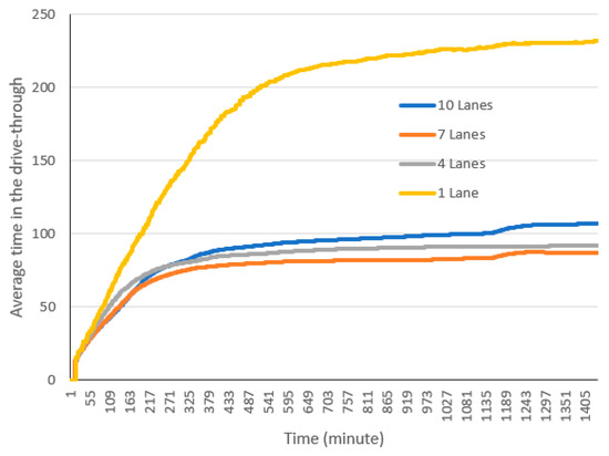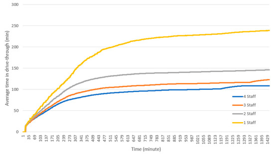 As illustrated in Figure 7, most cars spend between 80 to 90 min in the drive-through on average. Early users spend less time in the drive-through, however as more cars enter the drive-through and queues are formed, the wait time and thus the total time spent in the drive-through increases. The maximum time spent in the drive-through in this run is 96 min.
