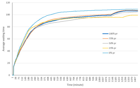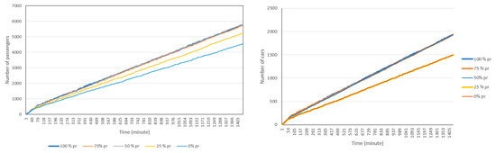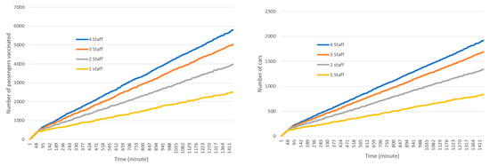 Pre-registration is one way to increase the efficiency of the drive-through vaccination by reducing the registration time, which is the lengthiest stage in the vaccination process. Pre-registration can be done through an online registration portal. In this experiment we allow the simulation to run with a pre-registration option but with different percentages of pre-registration. We assumed that 100%, 75%, 50%, 25%, and 0% of passengers have pre-registered for vaccination in respective simulation runs. By doing so, the registration time is reduced by 50%. Although not currently included in this simulation, it is possible to allocate special lanes to pre-registered visitors that significantly reduces their waiting times, to encourage more pre-registration. Figure 10 shows the cumulative (a) and non-cumulative (b) number of passengers and cars in the drive-through when allowing pre-registration. As expected, pre-registration yields higher throughput in terms of the total number of passengers using the service and decreases the average time spent on the drive-through in some cases (but not always).