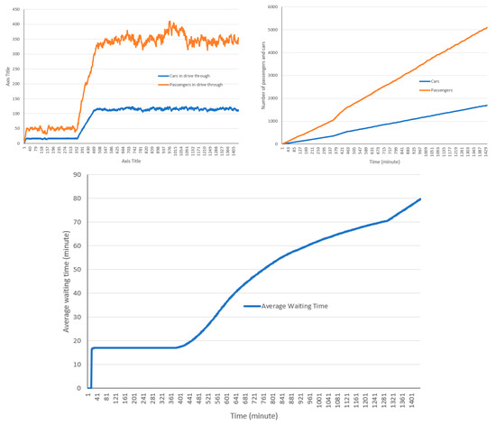 The cumulative and non-cumulative number of cars and passengers that entered and exited the drive-through are presented in Figure 5. In this model setting, a total of 1771 cars and 5330 passengers used the drive-through, while around 120 cars and around 290 to 380 passengers were in the drive-through after reaching its full capacity.