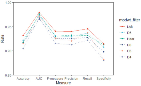 The choice of wavelet filters is important in conducting wavelet analysis. Different wavelet families have a trade-off between the degree of symmetry (i.e., linear phase characteristics of wavelets) and the degree to which ideal high-pass filters are approximated [40]. The selected wavelet should be well adapted to the events analyzed. Here, wavelet filters of length 2 of Haar, of lengths 4, 6, and 8 of the Daubechies family (D4, D6, and D8), of length 8 from the least asymmetric (LA8), and of length 6 from the Coiflets family (C6) were used as candidates to generate the MODWT coefficients, and hence the MODWT features.