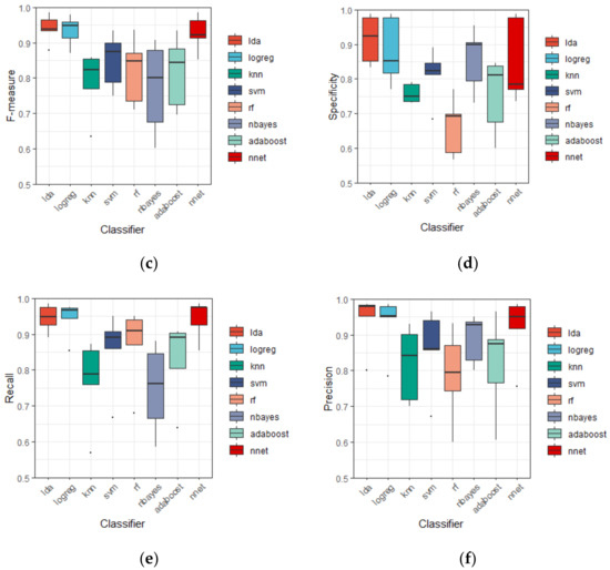 Boxplot of discriminant results by different classifiers using five-fold CV based on LA8 wavelet filter in terms of: (a) Accuracy; (b) AUC; (c) F-measure; (d) Specificity; (e) Recall; (f) Precision. Note: Each boxplot is constructed of the box and the whiskers. The box is drawn from Q1 (25th percentile) to Q3 (75th percentile) with a horizontal line drawn in the middle to denote the median. The upper whisker extends to the largest value no further than 1.5 × IQR from the Q3 (where IQR is the inter-quartile range, IQR = Q3 − Q1). The lower whisker extends to the smallest value at most −1.5 × IQR from the Q1. The dots plotted individually are outliners whose values are beyond the end of whiskers (±1.5 × IQR).