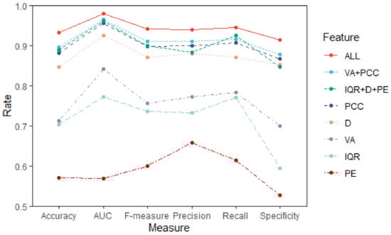 Furthermore, we are motivated to examine the inclusion of the five features to assess whether they provide useful information. The individual classification results for each feature as input to LDA are reported in Table 4, and this can be seen intuitively in Figure 4. The proposed parametric features (the combination of VA and PCC) and the nonparametric features (the combination of IQR, D, and PE) gave similar performance when discriminating NC and AD patients, showing the accuracy of 89.52 ± 6.32 (%) and 88.83 ± 4.18 (%), respectively. The PCC and D also gave relatively high accuracy of 88.18 ± 5.28 (%) and 84.75 ± 3.77 (%), compared with VA (71.32 ± 7.25 (%)), IQR (70.32 ± 9.38 (%)); and PE showed the lowest accuracy of 57.09 ± 19.75 (%) between the five features. The combination of all five features achieved the best accuracy of 93.18 ± 3.65 (%). The other five model evaluation measures gave similar comparison results.