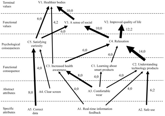 As shown in Table 6, the 40 respondents constructed a total of 120 ladders, with each respondent mentioning 6 ladders on average. In the links between attributes (A) and consequences (C), the link between “A3. Comfortable wear” and “C3. Increased health awareness” and the link between “A5. Correct data” and “C5. Satisfying curiosity” were the strongest (8;0), reaching a moderate level. In the links between consequences (C) and values (V), there was a strong link between “C4. Relaxation” and “V2. Improved quality of life” (12;2) and a moderate link between “C4. Relaxation” and “V3. A sense of social belonging” (10;0). At the consequences (C) level, there was a strong link between the functional consequence of “C2. Understanding technology products” and the psychological consequence of “C4. Relaxation” (14;0). In addition, there was a moderate link between “C3. Increased health awareness” and “C4. Relaxation” (6;0).