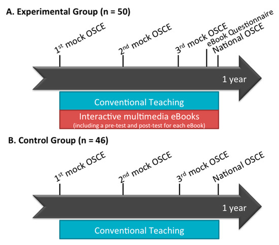 The participants enrolled in this study were medical students who were in their final year of medical school and doing clinical rotations in Kaohsiung Chang Gung Memorial Hospital, Taiwan. The control group consisted of 46 students who were taught clinical skills via conventional teaching, which consisted of teaching through direct patient care by a group of clinical teachers and senior physicians. The experimental group consisted of 50 students, which were taught by conventional teaching plus interactive multimedia eBooks. The learning outcomes of clinical competencies were evaluated using mock OSCEs and OSCE scores in the Taiwan’s National Medical Licensing Examination (National OSCE) to measure the clinical skill performance. Three mock OSCEs were held by Kaohsiung Chang Gung Memorial Hospital in August, November, and February. In the end, their final performance of clinical competencies was evaluated by the National OSCE. For an in-depth understanding of student experience with the eBooks, students in the experimental group were asked to perform a pre- and post-test included in each eBook session and anonymously answer a Likert-scale questionnaire. The experimental timeline is illustrated in Figure 1.