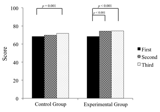 The average mock OSCE scores of the control group showed a significant difference when comparing the third exam to the first one (p = 0.001), whereas in the experimental group, there was already a significant improvement found between the second and first, and the third and the first mock OSCE scores (p < 0.001).