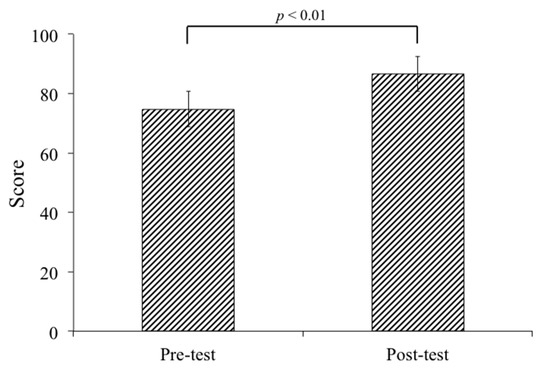 The students’ performance score on the post-test was significantly higher than the pretest (74.8 ± 9.87 for pretest vs. 86.6 ± 11.49 for posttest, p < 0.001) in the experimental group. Student’s t-test was used in comparison between pre-test and post-test. A p-value < 0.05 is considered statistically significant.